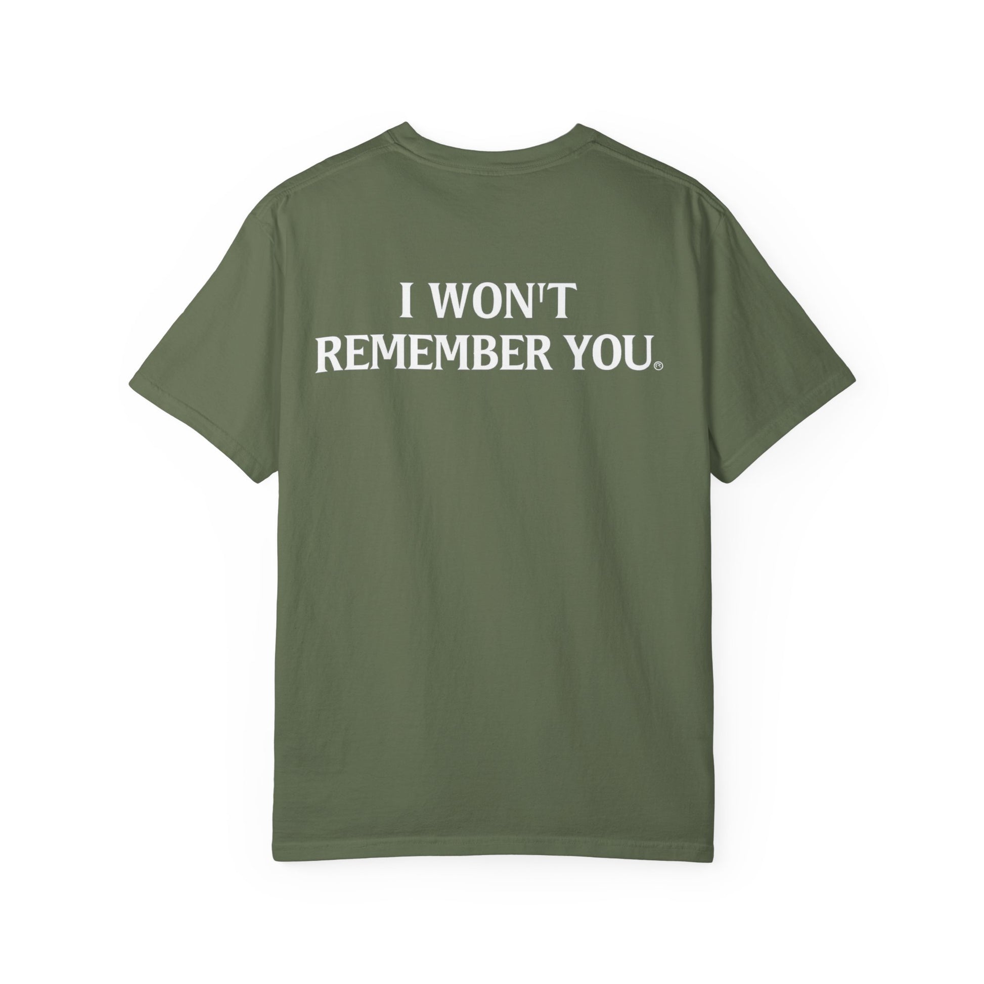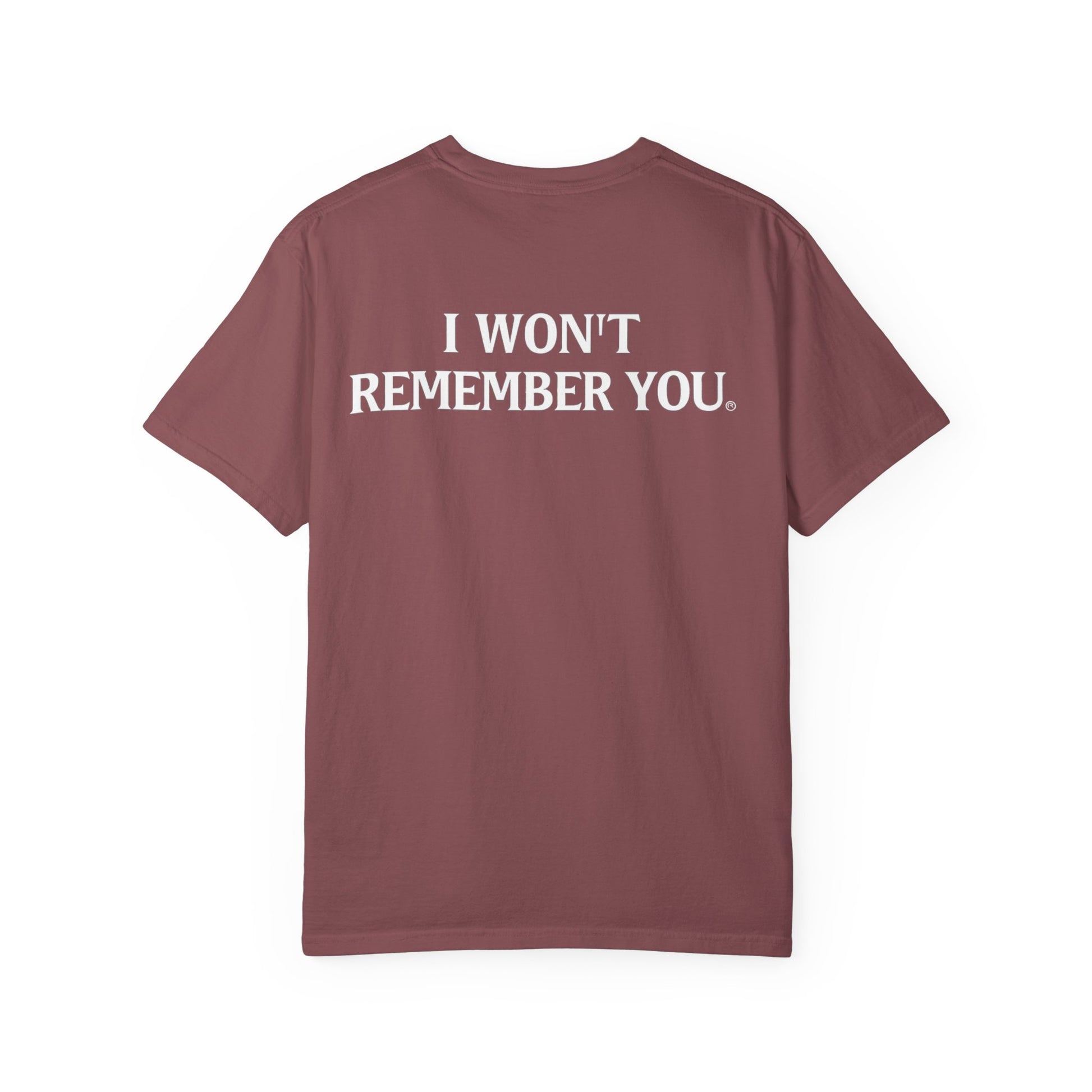 This men’s heavyweight t-shirt is crafted from premium ring-spun cotton, delivering a structured fit with a soft, lived-in feel that gets better with every wash. A clean “Eleven Fifty Nine Co.” logo sits on the chest, while the back makes the statement: “I WON’T REMEMBER YOU.” Bold, unapologetic, and designed for those who speak in style, not volume. Perfect for late-night bars or weekend hangs.